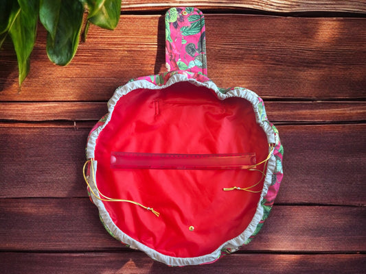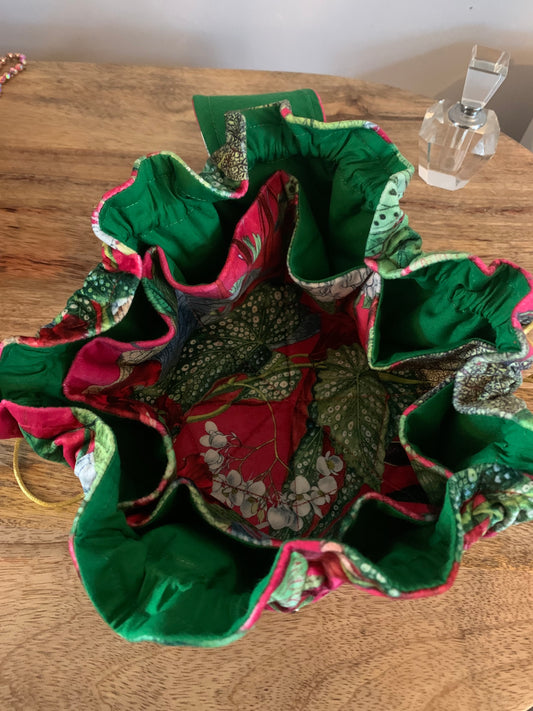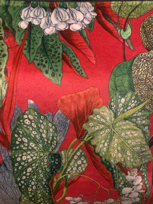 Green velvet botanical print wash bag /storage bag with a wipeable red lining