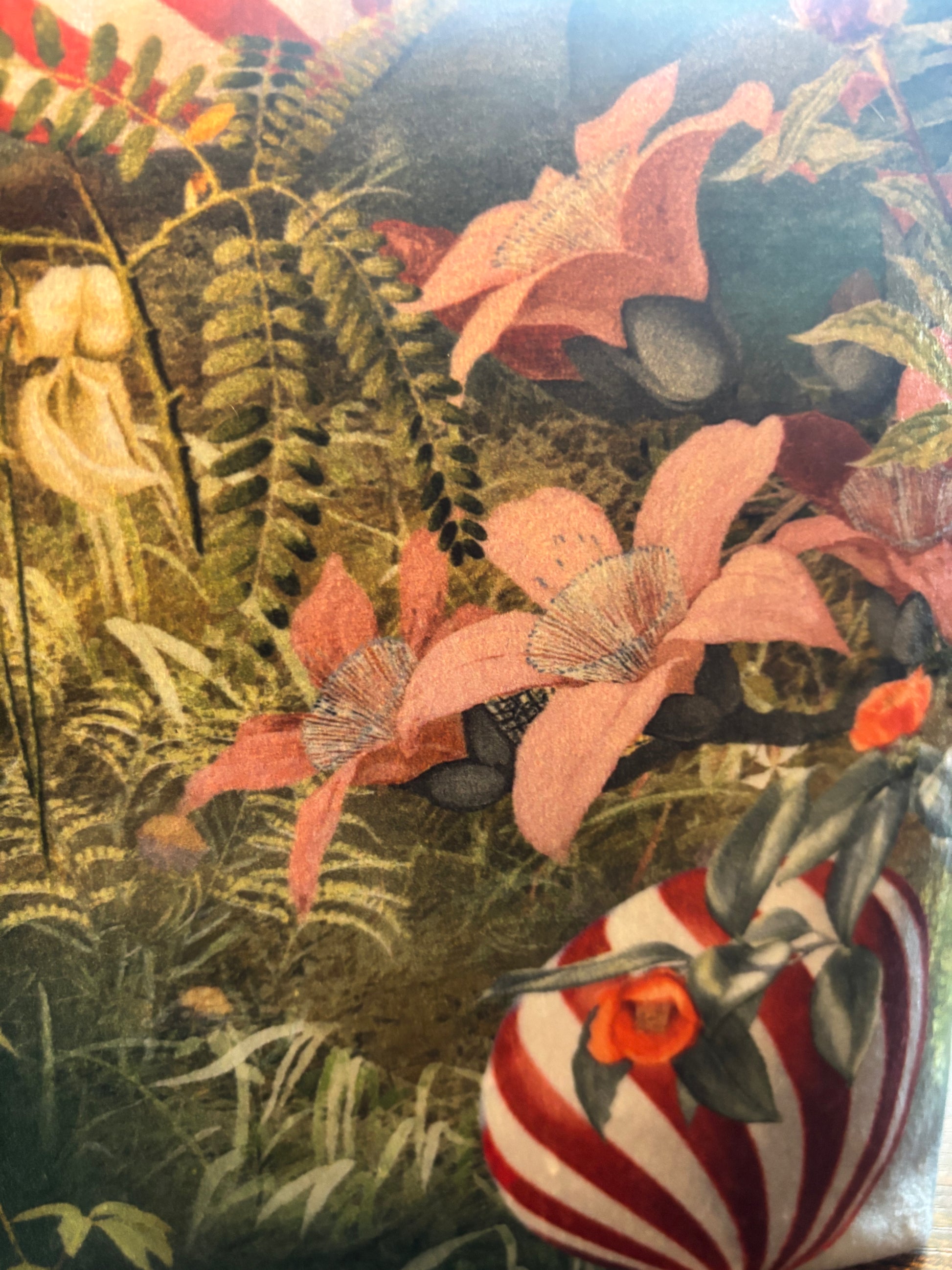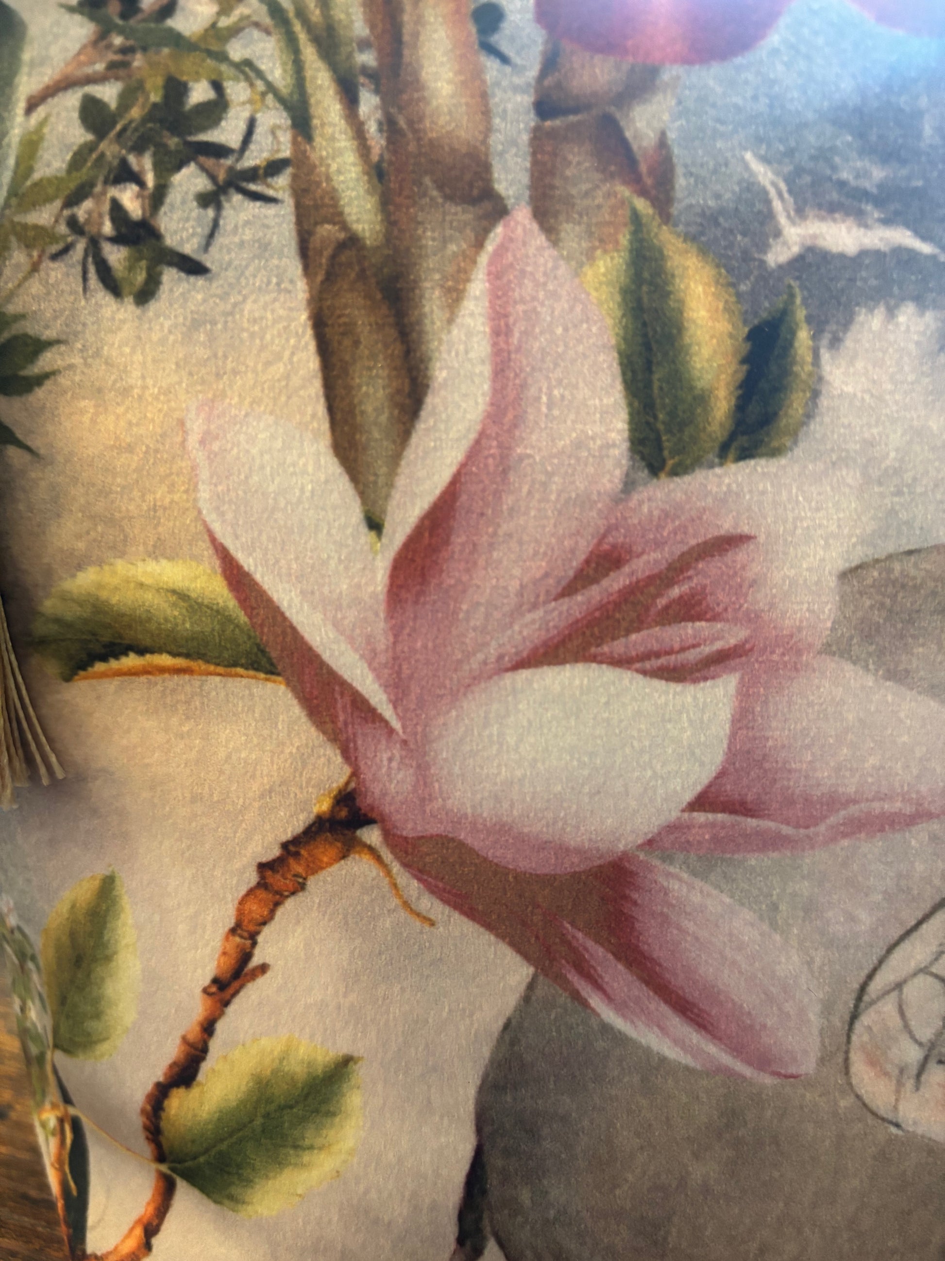 A Colourful or storage bag. A beautiful print with a gold silk zip pull tassel and embellishment. The bag has a red water resistant easy wipe lining with black zip and will easily fit your cosmetic and wash items.