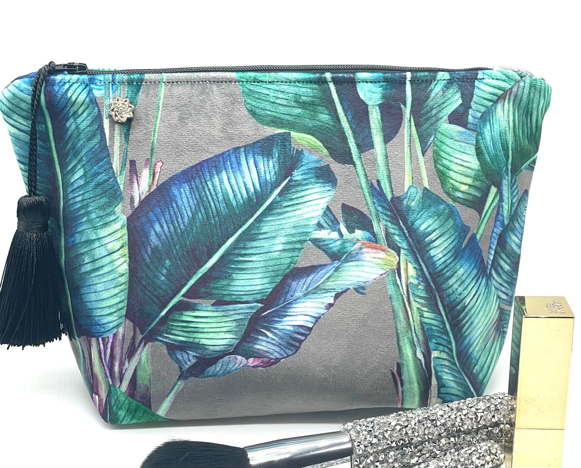Description: Handmade luxurious velvet super soft leaf print with a grey background Makeup or storage Bag. A colourful print with a silk zip pull tassel and embellishment. Has a thick black cotton lining with black zip.